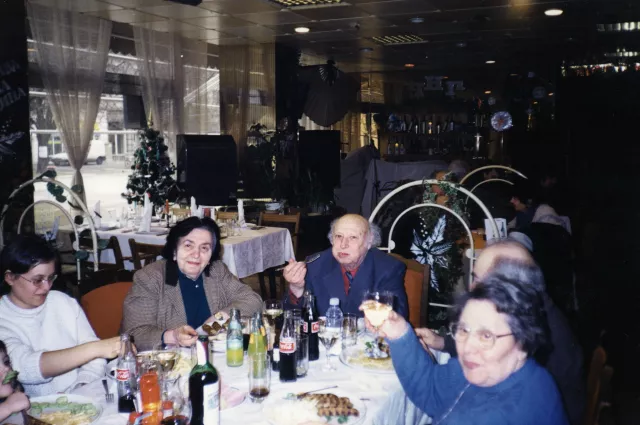 Here my husband and I celebrate someone's birthday, but I don't remember whose. I only remember it was in 2004. And, as you can see from the picture, we like having fun even at our age. My husband is in the center and I am second from left with the brown coat.