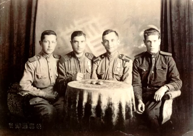 Thsi is me, Israel Gliazer, second from left, photographed with my friends during our stay in Pyongyang at the end of World War II. Standing beside me on the right is my Jewish fellow comrade Kon. He moved to Israel after the war. I have a medal 'For Combat Merits' on my chest. We are wearing uniforms of the Soviet army at the time of World War II.