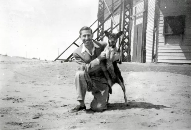 This is a photo taken in 1945-1946, when I was in Israel (Palestine at that time). I was working for the British Army then. They had this cinema at the Egyptian border. It was a military cinema called “Dunes” and the name of the place was Refah. We used to feed a dog then, and that’s it beside me on the photo. I don’t remember its name, but I do remember that he had the name of a person. This dog had also fed a few kittens, that I remember. It was a female dog, and when the kittens’ mother died, she fed them herself. I remember them breastfeeding on the dog.