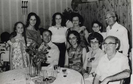 This is a family gathering at the house of uncle Baruh's elder son (Samuel Baruh, my mother's elder brother who died in Israel in the 1950s, but I have no further information about him). He is the first sitting from the right, he is wearing glasses. Faivel [Shraga was his nick-name, used by his friends. His official name was Faivel.] is the man sitting behind him and is also wearing glasses. Ruben is sitting in front of the flowers, smiling, in white shirt. His wife is sitting next to Ruben, wearing glasses and colorful dress. Around her are standing, most probably, Faivel's children. The picture was taken in 1975 in Israel.