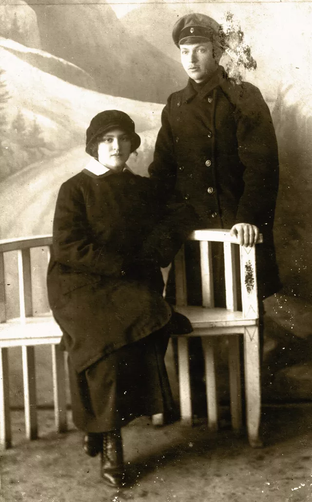 This is my uncle Jacob Nitsberg, my mother's elder brother with his fiancee, I do not remember her name. The picture was made before Jacob left to the front during World War I. It is written overleaf: "My last minutes in Chernigov before being sent for military service. As a keepsake for our friendship. 27.02.1915". The picture was made in Chernigov.