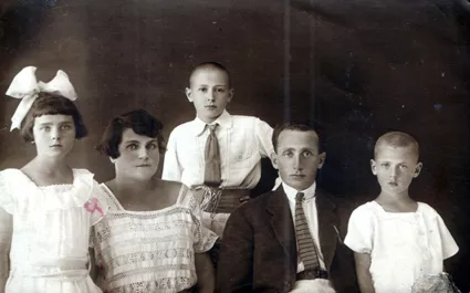 This is my father's family. From left to right, sitting: my father's younger sister Miriam Shaz (nee Rokhlin), my grandmother Eugenia Rokhlin (nee Chapkowski), my father's younger brother Boris Rokhlin and my grandfather Afraim Rokhlin. My father Jacob Rokhlin is standing. This photo was taken in Tallinn in 1922.