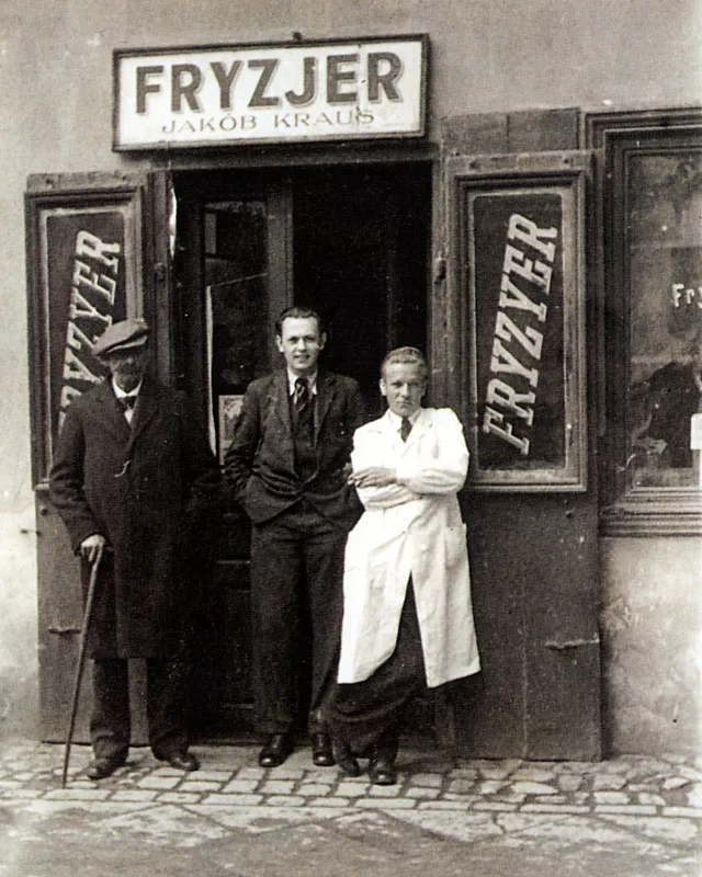 This is my grandfather, Jakob Kraus, in front of his hairdressing salon. Beside my grandfather, who is supported by a cane, is my school friend Romek Turchan and a barber’s apprentice next to him. I don’t know the name of the apprentice. The photo was taken in Cracow in 1936.