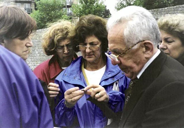 This is me, Jakub Bromberg, taking Jews from Argentine round the Jewish Lodz. The photo was taken in Lodz in 2000. I sometimes do such sightseeing with the Jewish tourists who come to Lodz and want to see the town of their ancestors.