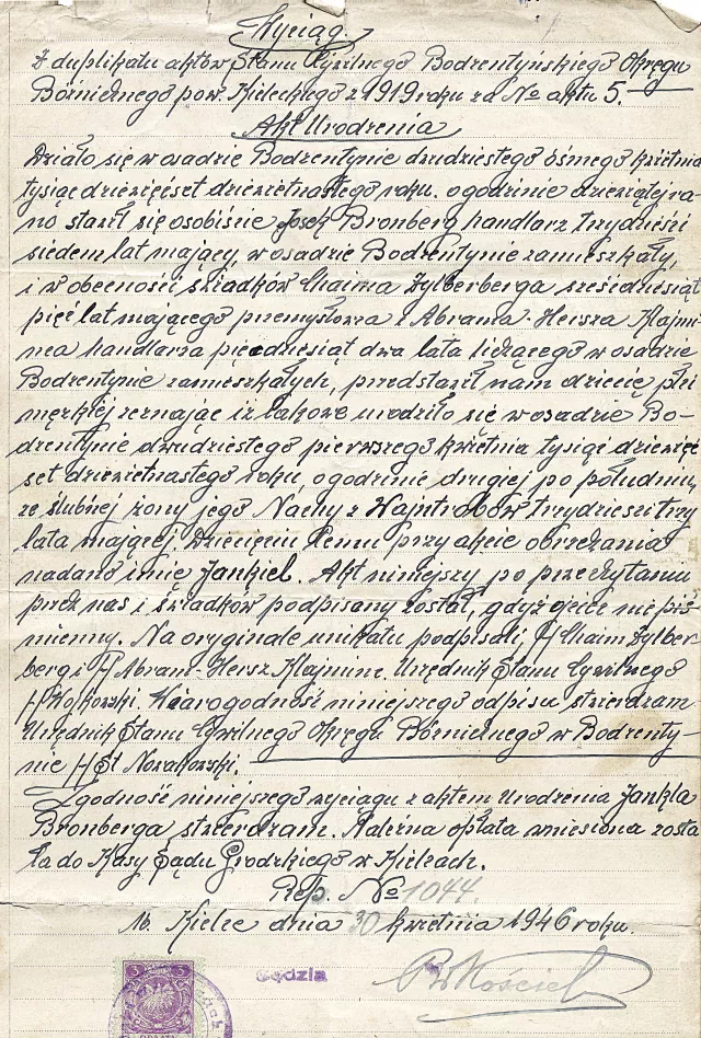This is my birth certificate, the first page of it. This is a document which tells about my birth, when and where I was born, who my parents were, what name they gave me...This is a duplicate which was issued after the war, in 1946.