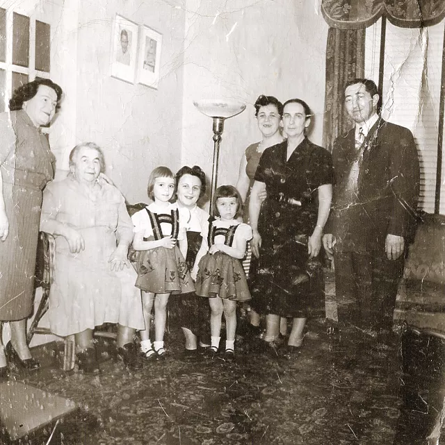 These are my relatives from Brazil and Canada. From left: Dora Kerszberg, nee Szafir, Bela Gewelc, nee Szafir, Bela’s daughter with her children, Dora’s elder daughter, my cousin Gitla Pollak, nee Szafir and her husband Harold Pollak. Dora and Bela are my father’s sister Zelda’s daughters. The photo was taken in Toronto, Canada,but I don’t remember when.
