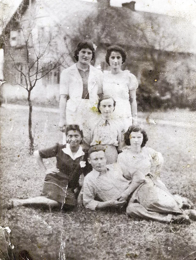 These are my friends from Poalei Zion. I don’t know where and when exactly the photo was taken. I don’t remember the names of all the people in the photo, only three of them: the girls who are standing behind are from right: Tajblum and Sieradzka, the man in front of them is Hersz Berlinski. He was a soldier in the Jewish Fighting Organization in the Warsaw Ghetto Uprising. He was killed in September 1944 in Warsaw.