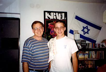 This photograph was taken in Brno, likely at the end of the 1990s. My grandson, Jan Gottvald (at right), and my nephew, that is, my sister's son, Gideon Holan (at left), had themselves photographed in Jan's room. On the wall in the background you can see an Israeli flag that Gideon had brought my grandson from Israel.