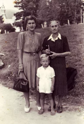 This is a picture taken in August 1946 in Vatra Dornei. The person in the right is my maternal grandfather's sister, Janeta, on her left is her daughter Ghizi, and the child is Puiu Droniuc, Lidi Droniuc's son, who was aunt Janeta's other daughter.