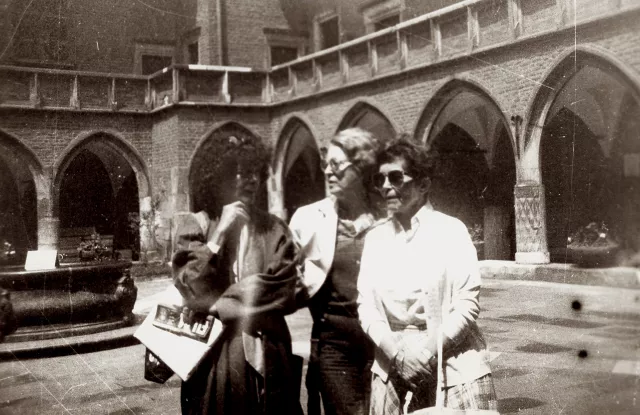 I’m standing in the middle. On the right is my second-degree cousin Anna [Niuka, daughter of Toncia and granddaughter of Adolf, my grandfather’s brother on my mother’s side], and on the left is my husband’s cousin Irena Gal from Jerusalem. Both of them were visisting us. After the war Niuka emigrated to Sweden.