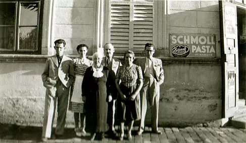 This is a picture of my husband and his family: his father, Adolf Brand, his mother - Judit Kalman, his maternal grandma - Lina Zsigmond nee Markovits, his brother - Sandor Banyai and his wife, Olga. They are photographed standing in front of their shop in Nagykanizsa. My husband, Janos Banyai was from Nagykanizsa, born in 1916, died at the age of 87 last year. One year ago. Originally, he was a watchmaker, then he graduated from the Economics University, then he finished a steel-industry technical [school], he liked to study, he studied a lot. In the end, he was always a watchmaker. He was a technical manager too, but he loved watch making so much, that he gave up the manager position. He retired as a watchmaker, poor man. He was sick a lot, in the end he went blind, struggled a lot. He was spoiled as a child, his parents' second son. They were originally the Brands. In 1929, they wanted to emigrate to America because they already had relatives there. Big families were popular then. They were a big family, and a part of it emigrated. I think, two or three of them were in America, and they also got ready to immigrate. But for some reason, it didn't work out, I don't know why. Then they magyarized their name to Banyai. And since 1929, they were Banyais. His parents had a little shop, it went really well. His great grandmother was called Lina Markovics. Mrs. Zsigmond Kalman nee Lina Markovics. My mother in law was called Judit Kalman. My father in law was Adolf Brand. My husband had an older brother who was called Sandor Banyai, his wife, Mrs. Sandor Banyai, was my cousin, Olga. My father-in-law and mother-in-law and her mother were killed in the war. My husband's family was well-off, his parents had a spice business in Nagykanizsa. They pillaged that along with their small warehouse. The house and the business were left there, empty. They took everything. From the dulcimer to the expensive pictures, the goods and the shelves, too. Then they sold it after the war for 13,000 forints, a four-bedroom apartment and the business.