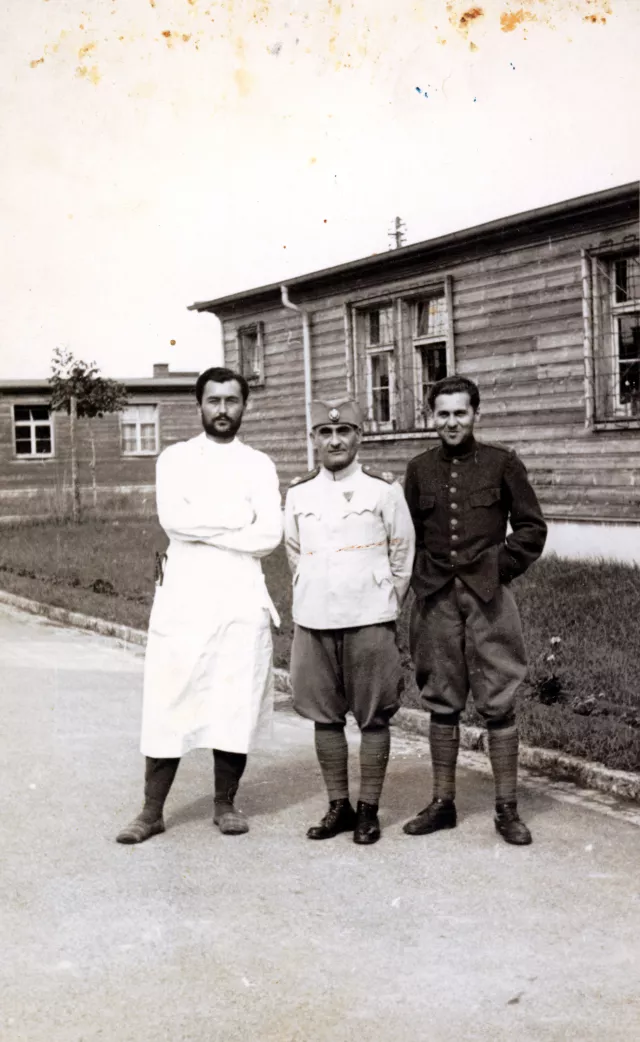 My father Haim Baruhovic is pictured here with with two other POWs outside a building in a POW camp in Biberak, Germany. The photo was taken in 1942.