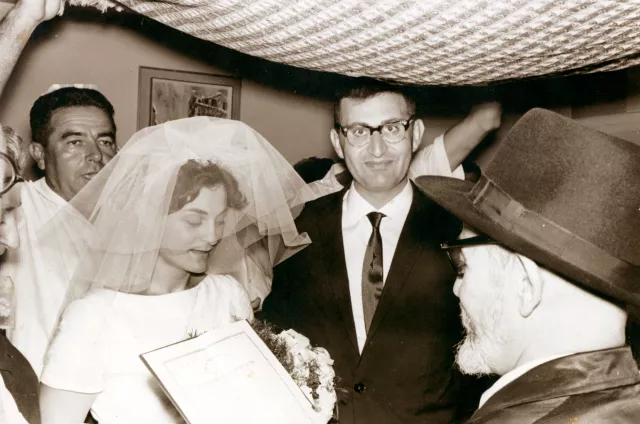 This is my sister Seli and her husband, Shimon Malina, under the chuppah. The photo was taken during their wedding in Kiryat Moskin in 1963.