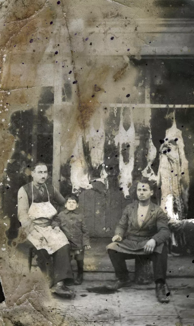Josif Kamhi with his father Albert Kamhi in front of his butcher’s shop