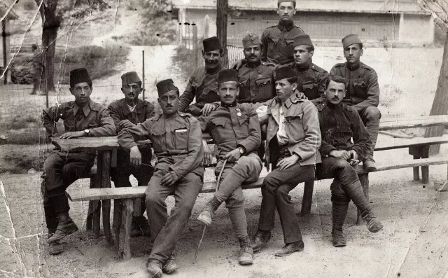 The photo was taken in Bekescsaba, in 1917. My father Abram Papo was a soldier in the Austro-Hungarian army for 8 years. He was wounded in the Carpathian mountains and went to the Bekescsaba hospital to recover. His friend, Juda Kamhi, from Sarajevo is sitting next to him. My brother-in-law's father is also in the picture. I don't remember where he is sitting.