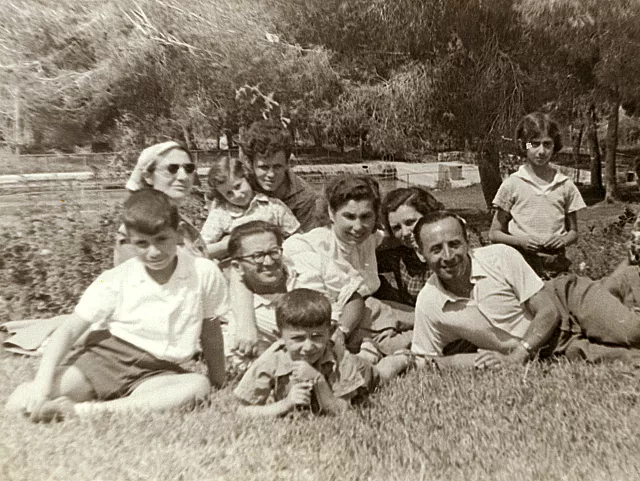 This is the family of my brother, Jozef Nieznanowski. They lived in Israel. My brother is in the middle, his wife, Guta, nee Rozenfeld, is wearing sunglasses. Their oldest daughter, Rachela, drowned in a swimming pool. They also had another daughter, Hadasa , she is a teacher now, and a son, Michal. On this picture you can also see the Rudawski family. The photo was taken in the 1950s.