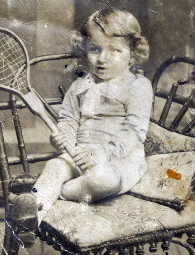 This is me when I was three or four years old. I was in Presov with my mother and the picture was taken in a studio. The photographer gave me a racket, a bird was singing and I had to smile.