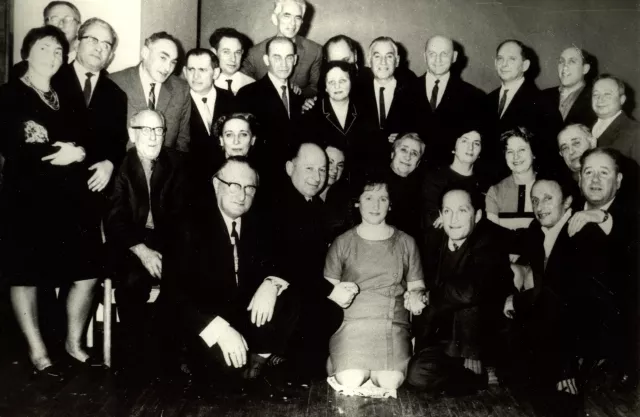 This is the meeting of the Kedainia Jews in Vilnius, the survivors from war. I’m the second to the right below. In the center is Chava Revich, her maiden name is Schneider. She is currently living in Israel, then Dushkes. He is also living in Israel. The fourth to the right in top row is underground communist Upnitskiy. He died in the 1970s, then Verestein. He was in the lines. He lived in Vilnius, got married there. The second to the right is Gabile. All of them, but Dushkis and Chava, passed away.…