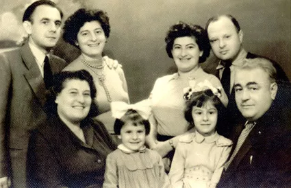 This is our family. From left to right, sitting: my mother Szerena Edelmann, my daughter Ludmila Haikis, my niece, my sister's daughter Yulia Levenberg, my father David Edelmann. Standing: my sister's husband Leopold Levenberg, my sister Katerina Levenberg (nee Edelmann), me and my husband Adolf Haikis. This is our family gathering on my mother's birthday. This photo was taken in Uzhgorod in 1958.