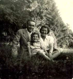 These are my parents Szerena and David Edelmann and me. This photo was taken during my father's being detained in the camp for political prisoners. My mother visited him once a month. Once she took me with her and we were photographed together. This photo was taken near the prison in the mountains near Garany town in 1942.