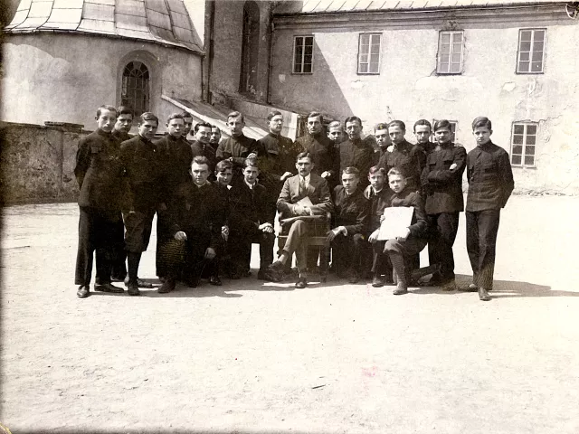 I took this photo in 1930. We are standing in front of our school building. Among us, sitting in the center, is Konradi, the Latin teacher. I am standing third from right, and second from right is my best friend and future brother-in-law, Mosze Baum.