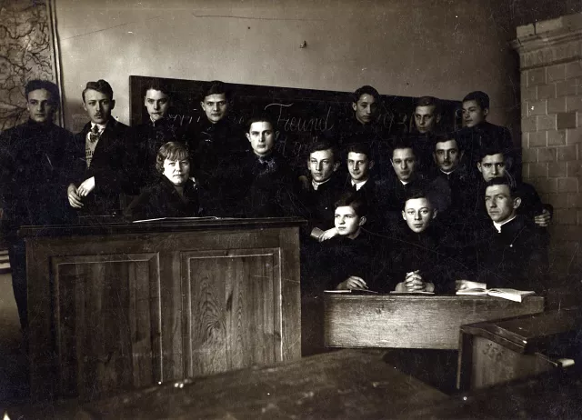 We are standing in the classroom. You can see a tiled stove, benches with desks that opened, and sitting among us, in the center, is Irena Breneisen, the German teacher.