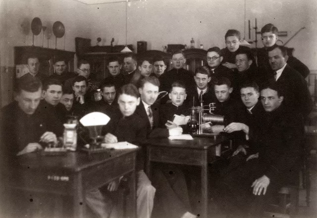 This photo was taken in 1930. We are sitting in the physics and chemistry laboratory. First on the right in the second row is our physics teacher, Zybert.