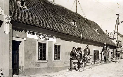 This is my maternal grandfather, Julius Bondy, and his wife, Maria Bondyova, nee Buchwaldova. They produced soda water. This is the front of their house on the main square in Holic. They are sitting there along with a hairdresser who later became a very ardent fascist. My grandparents weren’t rich.