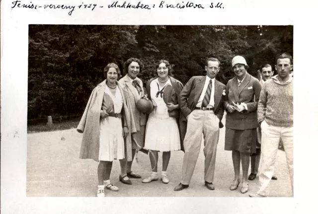 This was in 1929, in Bratislava, at the Maccabi tennis competition. From left to right, Dr. Balog's wife, then me. Frida Vertes is standing next to me, she was a tennis player from Kosice. She got married in Bratislava. From the right, the first woman's name was Vilma. Unfortunately, I don't remember her last name, but she also played tennis. She was from Malacka. From the left, the first man is a player named Wahlman, who played in the Maccabi. He was a functionary in the Jewish sports union. From the right, the first gentleman was called Emil Freistadt. He was a well-known person in Bratislava. They had a sport shop on Sedlarska Street for more than a century. In 1939, he escaped to Palestine and fought there until the end of the war. He came back here just as Israel formed. He married here.