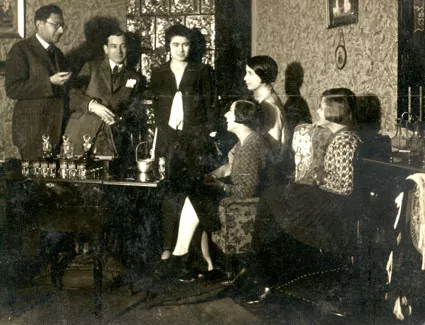 These were my good friends, and they used to come over every Saturday afternoon and Sunday. From the left: Mihaly Politzer, Berkes, Manyi [Margit] Kaufmann, Rozsi Ignac, Anci [Anna] Kaufmann and myself. On these occasions my sister Manyi used to play the piano and Anci used to sing. The photo was taken in Carei in 1939