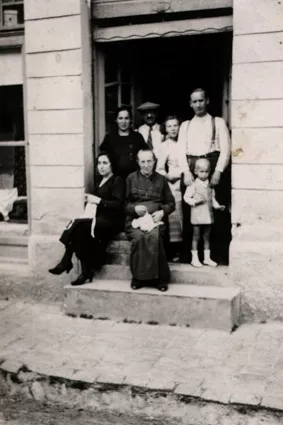 This photograph was taken in May 1936 in Kokava nad Rimavicou. It shows my grandparents’ store. Standing on the left is my mother, Klara on the right my father, Julius Engel, with my brother, Pavel Spitzer, and standing in the middle are the Pomsteins. My grandmother and Aunt Melania are sitting down.