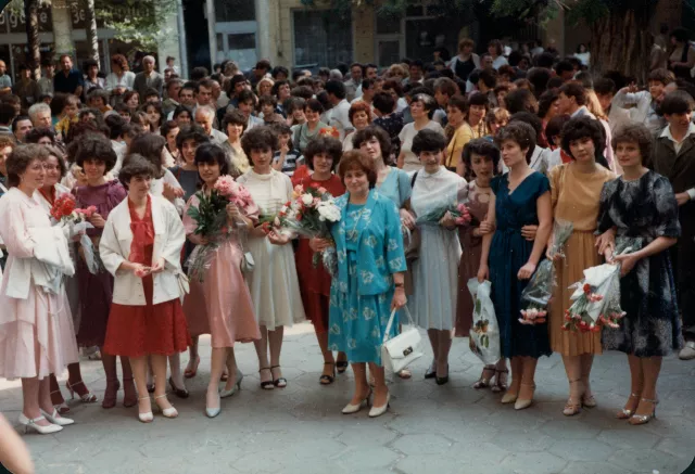 Here I am at the graduation of my last alumni in 1985 as a teacher in the 18th School 'St. Cyril and Methodius' (now 'William Gladstone') in Sofia. I am the one wearing a blue dress, with the bag and the bunch of flowers in the center.