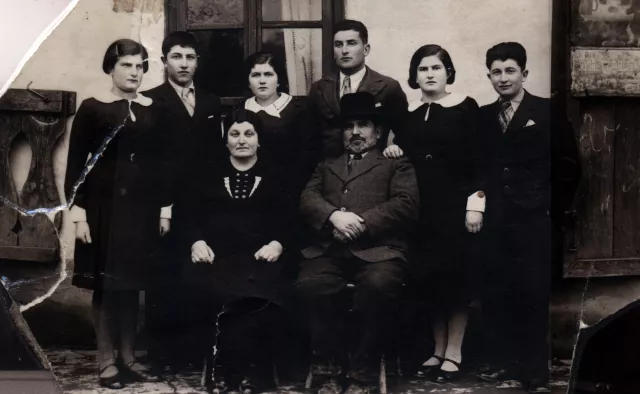 This is a picture of my family, taken in Breznica in 1935. You can see my father Aron Kleinmann and my mother Ester Kleinmannova (nee Gruenwaldova) sitting in the middle. My father was born in 1880 in the town of Ladomirov, which was in Austro-Hungary at the time and my mother was born in 1882 in Breznica, Slovakia under Austro-Hungarian rule. On the photo you can also see my oldest sister Tonci Berkovic (nee Kleinmannova), born 1910 in Breznica, then my brother Iosef Kleinmann who was at home on a leave from military service. Therefore he didn´t wear a uniform. My twin brothers Max and Adolf Kleinmann were born 1914 in Breznica. I had another sister Malvina, born 1919. I am also on the photo. I was born in Breznica in 1921. We were eight children, the oldest one was my brother Nabel who left for America and changed his name to Irving Kleinmann when I was 22. He is not on the photo. There is one more brother whom you cannot see on the photo, that's Emil Kleinmann. He was married, and therefore wasn?t living with us.