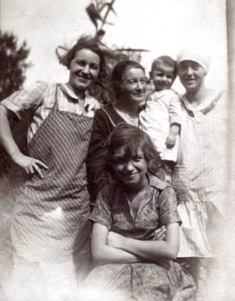 This picture was taken in 1927 at the Ujpest house. From left to right: My mother, Rozsa Kauders, Antonia Singer nee Goldstein, on her arm is my older sister, Klari at age two, and finally Ilonka Goldstein at age sixteen. Sitting in front is Erzsike Klein.