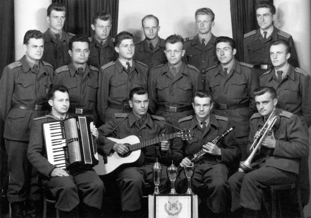This picture was taken in the 1950s in Frydek Mistek. It is some horrible army chorus in which I was singing. I'm the second from left in the middle row.