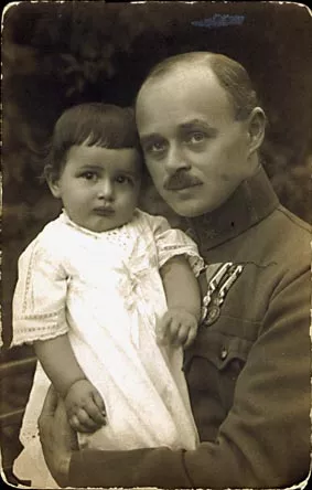 In this picture, my father, Sandor Gunst, is holding me. I was probably about one year old. My father is in uniform, you can see his commendation medals, too. The picture was taken in Szentes in 1917.