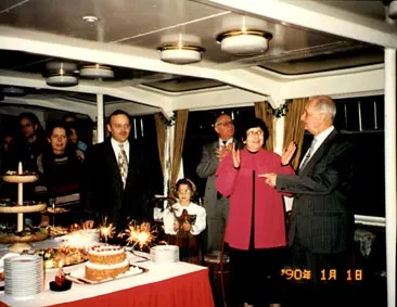 This picture was taken on my 80th birthday in 1996, on a boat in Budapest. Our whole family is in it. My wife, Zsuzsa, is standing beside me. The little girl is one of my granddaughters and next to her is my son G. The party went really well, all of us really had a great time.