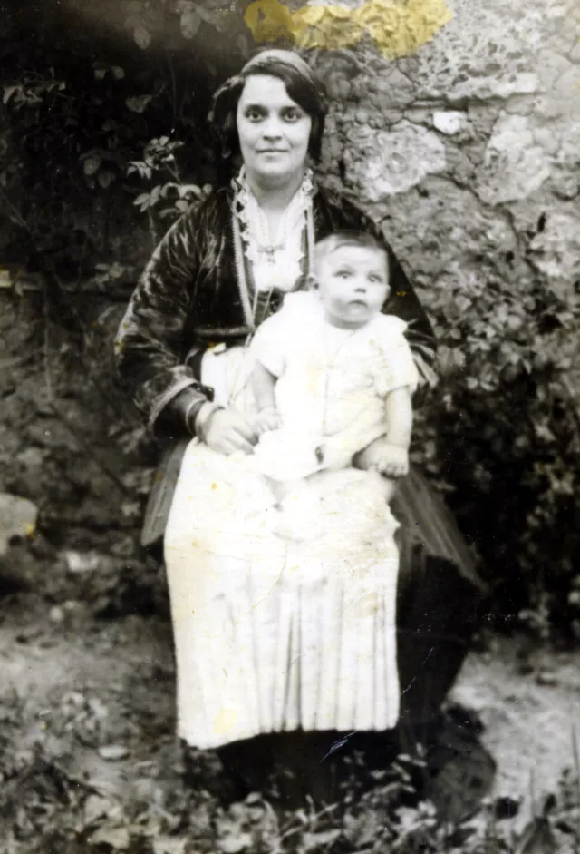 She is wearing the traditional clothes Jews were wearing at the time, it was called ‘kofta.’ You can see she is holding her little baby in her arms.