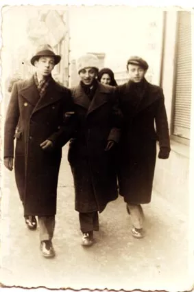 Here you can see me (first from right) next to a friend of mine, Zuli Harabagiu, who lives in Paris now (in the middle). Next to him is Lazar Copolovici, a victim of the death train in 1941. His brother, Moise Copolovici, who is not in the picture, also died in the death trains. Moise was born one year after Lazar. This picture was taken in January 1940.
