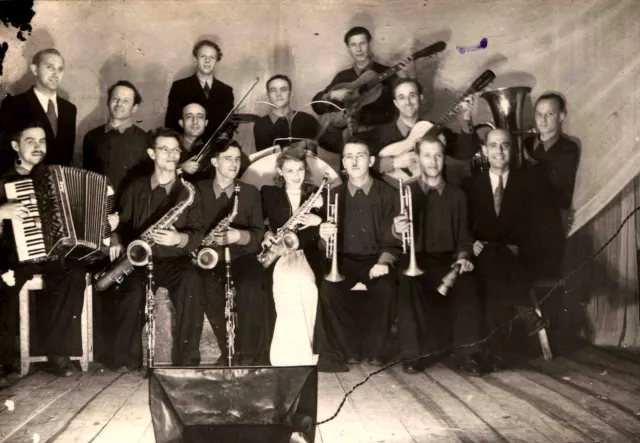 This is our camp orchestra on a tour in November 1944. I the 1st on the left in the upper row.