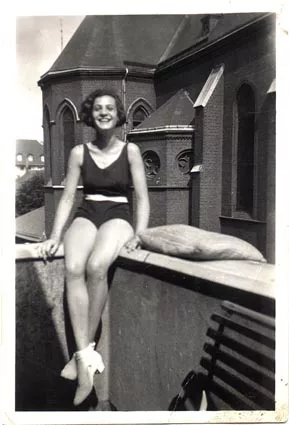 This is me on the balcony of my maternal granparents? house in Barmen [from 1929: Wuppertal], around 1931. The balcony overlooked the yard of a church, because their house was near a church. I must have been around 17 in this picture. There was a street behind the church, and I saw marches on that street several times. This was already the Hitlerjugend, only I didn't know it.