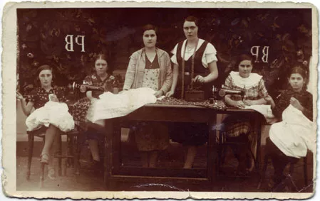 My mother, Leia Rotaru, learned tailoring, and this is the workshop where she learned the trade. My mother is second from the left, her sister, Ruhla Roizen, is second from the right; of the two persons standing, the one on the right is probably the master they were apprenticed to and the others are fellow workers. The photo was taken in Hanesti in the 1920s.