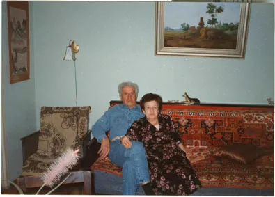 The photograph was taken during a visit of some of our relatives or acquaintances from Israel. From what I remember, the photograph was taken around 1970-1975. You can see a Chinese painting on the wall and a lamp post next to the sofa we owned a long time ago. I, Leizer Finchelstein, am the one on the left, and my wife Devora is on the right.