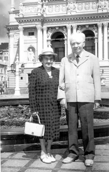 I, Leo Lubich, and my wife Rosa Finkler, photographed during a walk near the Opera Theater in Lvov in summer 2002.