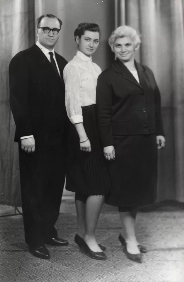 This is my favorite photo. We call it "our Sofia trio" at home. I keep it as a nice remembrance. My daughter Dolya had just graduated with excellence from high school [133rd "A.S.Pushkin" school in Sofia in fact was a communist elite high school before 1989]. At the time when this photo was taken I worked as director of 'Stroymatmetiz' state trade company and my wife Berta worked as a journalist, revered and well-known in Bulgaria. My daughter Dolya Leon Andreeva, nee Kalaora, was born on 6th January 1948 in Sofia. She finished the Russian high school ‘A. S. Pushkin.’ Once a classmate of hers in the elementary classes mentioned to her that she was a Jew. She returned home puzzled and asked us, ‘Mum, dad, are we ‘evreitsi’? [Editor’s note: The correct word for Jews in Bulgarian is ‘evrei’; hearing the word the first time she used a made-up incorrect version.] Then she graduated from the Faculty of Architecture Institute of Sofia University. While she was a student there, she had the following experience. In the break between two lectures the students in the corridor were talking to each other divided into two groups. Dolya and her friends were in one of the groups and a Syrian student with his Bulgarian friends in the other. One of her colleagues from the other group said something insulting about the Jews and Dolya went to him and slapped his face. Today Dolya is married and has a son and a daughter. Her husband is also an architect. He is Bulgarian.