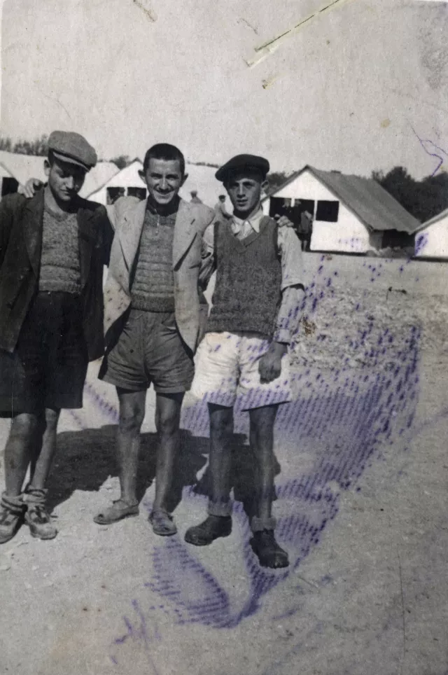 In this photo you can see me in the middle with my closest friend Izidor Benbasat, on the left, in the labor camp in the village of Rudnik, Varna district. Next to me, on the other side, is Niso Chetkarya. Behind us you can see the rooms where we used to sleep. On the back of the photo there is an inscription in pen: '1942, the village of Rudnik, Varna district. Jewish labor camps with Izi Benbasat and Niso Chetkarya. Leon Anzhel.' There is a stamp of a photo shop: D. M. PESACH PHOTOGRAPHER, Sofia, 15 Opalchenska Street.