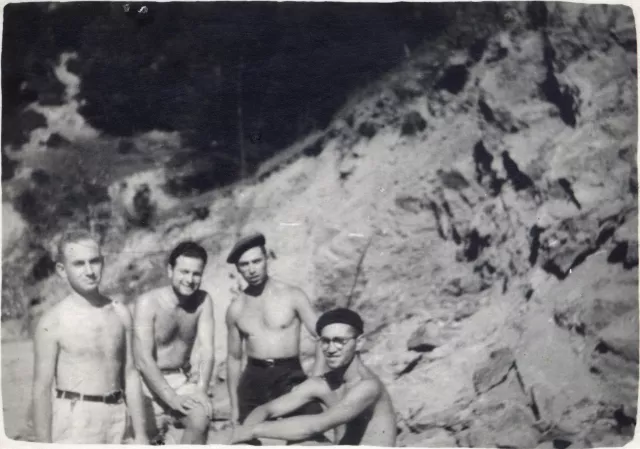 This is the [forced] labor camp in Klisura village, Tran region. First on the left is Fiko Surojon, next to him is my brother Izi [Izak]. I cannot remember the name of the man next to my brother. I am first on the right.
