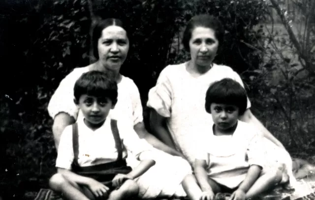 From left to right (upper row): my mother Rachil Kotliar and her sister Tania (Toibl) Risman. Lower row: I with my brother Roman Kotliar. My mother had returned from hospital (she had breast cancer and had a surgery). We were having a stroll in a park and had this photo taken by a photographer. Kiev, 1927.
