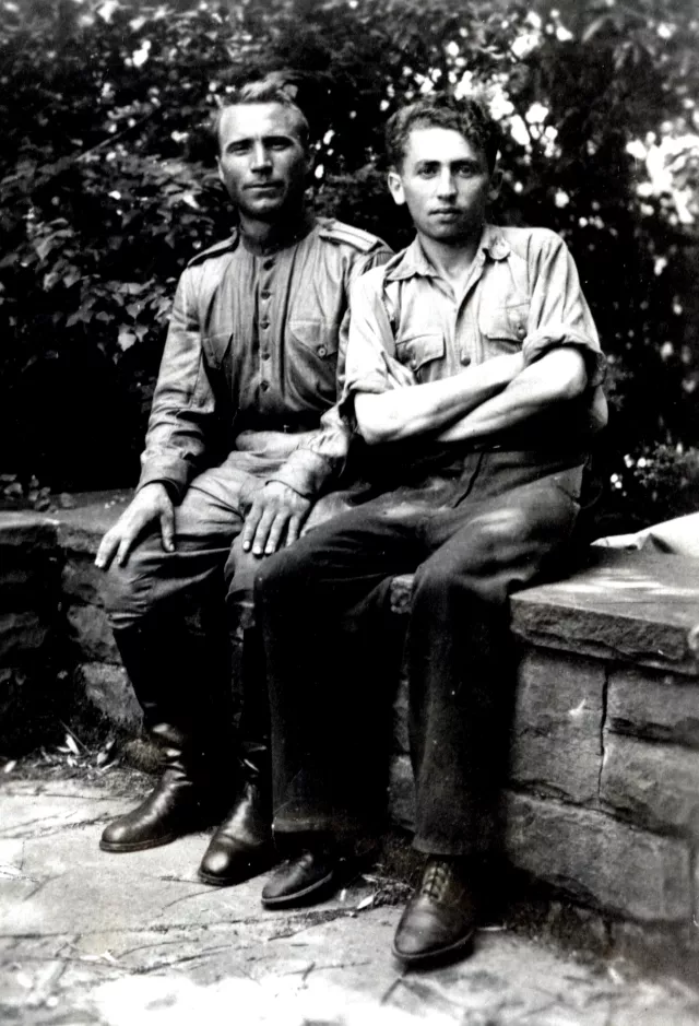 On the left is my friend Alexandr Pohitelyuk and me in Germany. After the Victory we worked at the Soviet car repair plant 'Porsche'. I sent this photo home signed on the backside: Here is a proof that I am alive. To my dear parents from their 'prodigal son'. Stuttgart, summer 1945.