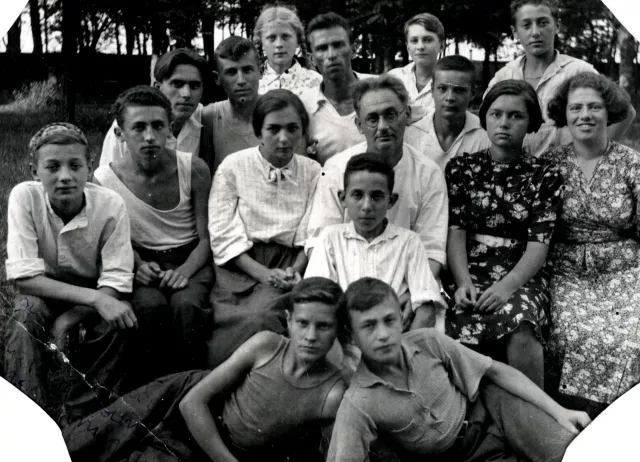 The last peaceful summer of 1940 when I was staying in a children's tuberculosis recreation center before the war. I am in the second row the second from the left; the fourth from the left - director of the recreation center Pyotr Mitselmakher, the first from the right is my future wife Ghita Kaplunovich. Our group was photographed in late July before leaving the center. My group mate signed this photo: 'You have a wonderful influence on your friends. Stay as good as you are. 30.07.40. Larisa'. Budayevka, 1940.